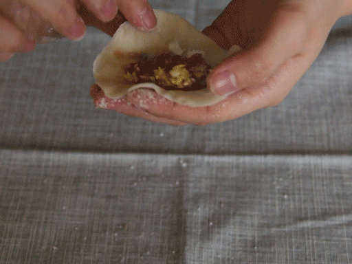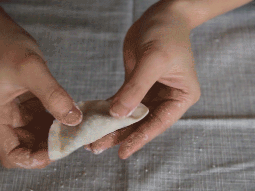 包入馅料,对折成半圆形,捏牢中间,将右半边饺皮封口,同样地将左边饺皮封口,将饺皮封牢,饺子两端向中间弯曲,将两端饺边相互捏牢,使半圆形微微上翘。