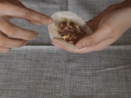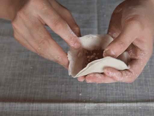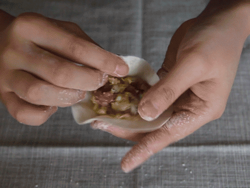 取饺皮一张于掌心,放入适量馅,将饺皮对折立起,两手的食指和拇指分别从饺皮左右两端往中间捏,中间自然留一个口,把左右两边合拢,留口部分折起捏牢,两边各形成一条褶折。