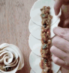 取饺子皮一张放上并放入馅料,将右端边角捏住,右手拇指向外轻推内侧皮,食指将外侧皮形成褶折,右手拇指奖褶折捏紧,重复步骤至左端饺边并将两端封口处捏牢。鉴于难度系数较高,详细步骤图奉上!