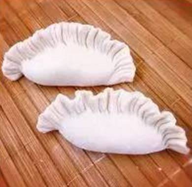 取饺皮一张于掌心,放入适量馅,将饺皮对折封口成半圆形,食指稍过拇指前捏住饺边,食指微微将饺皮往前推出褶折,重复褶折直推至右端顶处放手,这样一只波波饺就完成了。