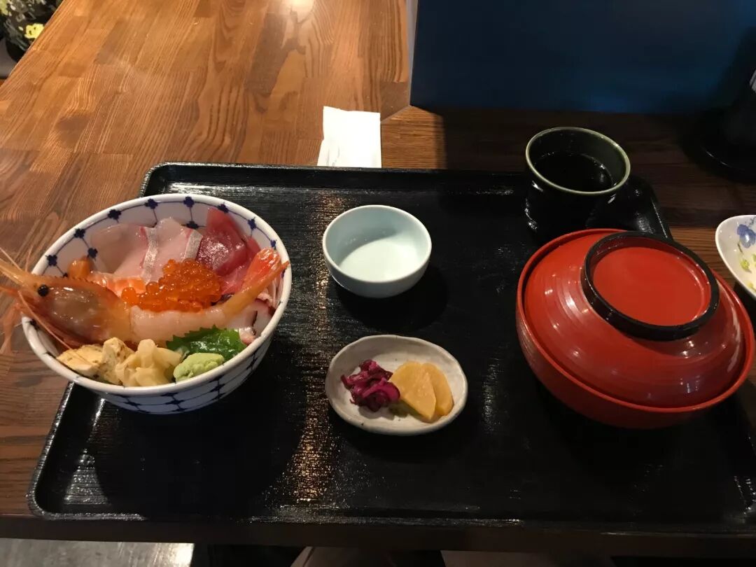 脊肉还不算最便宜的,好多店都提供免费的试吃,从头走到尾,就能吃金枪鱼吃到半饱。当然,如果想真正吃饱,还得去店里,除了那些一直开在场外市场的老店,“筑地鱼河岸”的三楼,还有一个“鱼河岸食堂”,性价比非常不错,一份海鲜饭套餐加鮟鱇鱼肝,一共2000多日元。