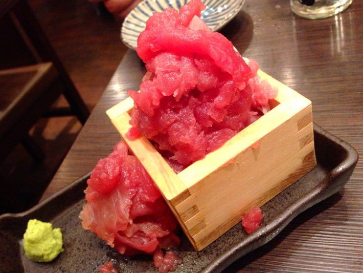 现在不一样,在新市场里,可以看到拆解完的各部位鱼肉,还能看到鱼店老板从金枪鱼脊骨上用勺子往下刮脊肉(中落ち)。虽然这种脊肉不好看,跟肉馅似的,但它是鱼身上最好吃的地方,和葱末拌起来吃特别棒,而且非常便宜,几百日元(几十块钱)能买一大盒。