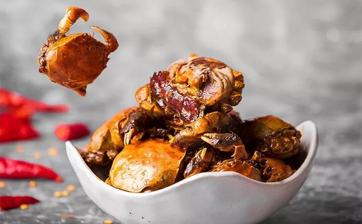 再过油三分钟,辣卤烧制十五分钟,出来的香辣蟹,肉恰好吸收卤汁的香味,入味而不老。融合了川辣精华的劲爽辣卤,遇上迷你蟹,足够麻辣畅快,吃了不会口干舌燥,只会给你冬日的温暖。