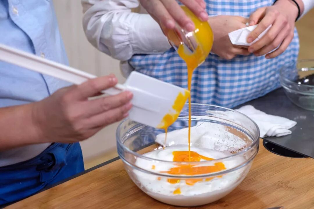 将蛋黄轻轻拌入打发的蛋白中,蛋白和蛋黄搅拌均匀。