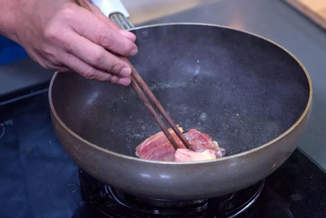 将去骨鸡腿肉鸡皮朝下,煎出鸡油。