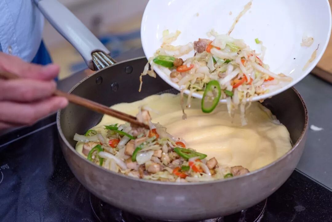 将备用的鸡丁蔬菜放在蛋上,铺成半圆形。