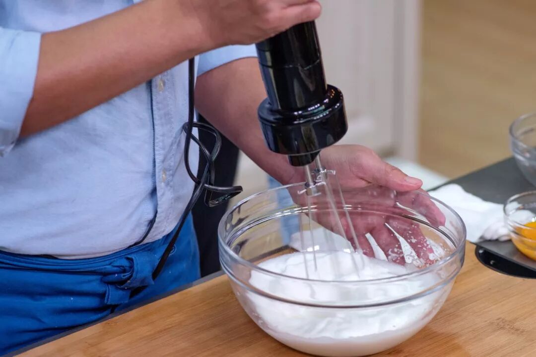 用搅拌器将蛋白打发。