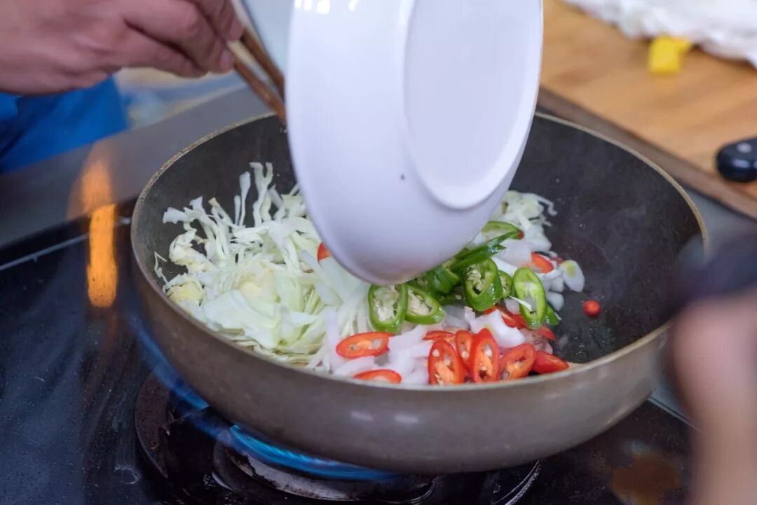 将切好的蔬菜加入锅中一起煸炒。
