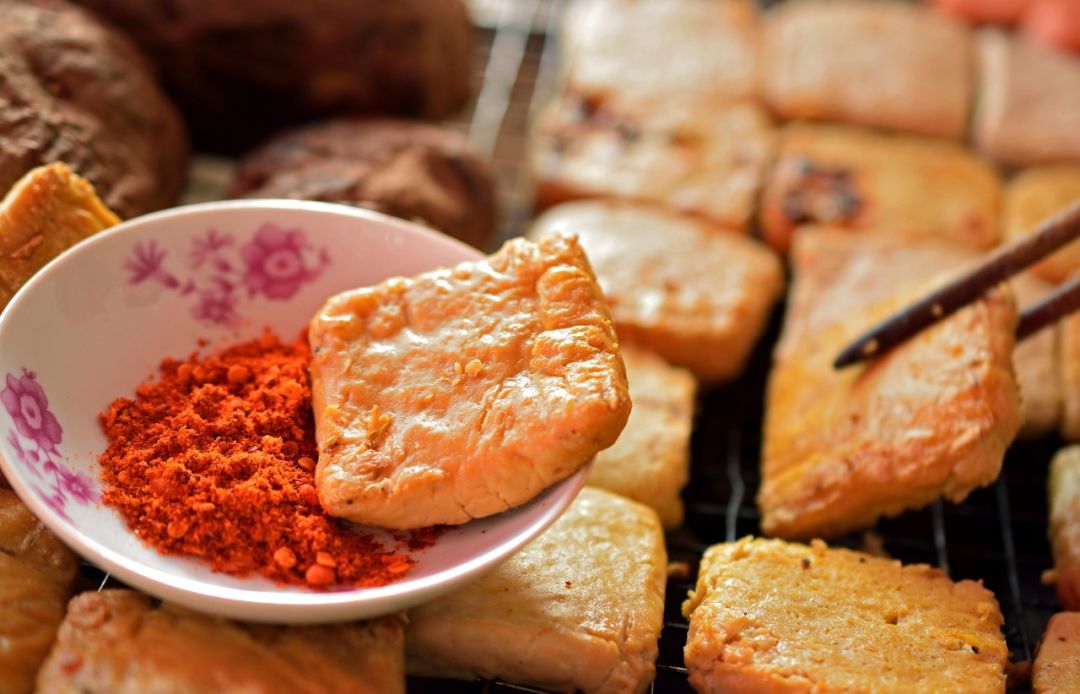 可以蘸着辣椒面吃的除了洋芋粑粑外,还有烤小豆腐。所谓“烤小豆腐”就是在炭火盆上面架着一个铁丝网子,将长宽各3CM厚1CM的小块豆腐烤得吱吱冒油发黄,表面焦黄皮脆。