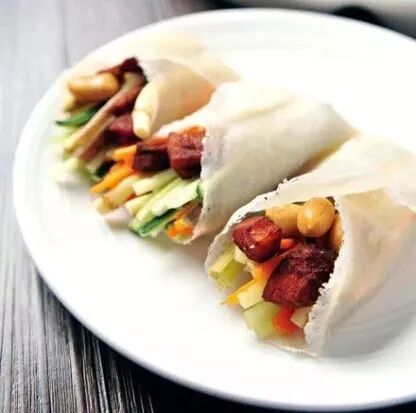 吃丝娃娃,一般是先将手洗净,把饼摊在自己手心里,然后夹上自己喜欢的配菜放在饼上,接着把饼卷起来,一边封口一边开口,最后从开口处用勺倒入少许蘸水。如何能让蘸水不漏在手里又能吃到丝娃娃里的蘸汁,多吃几次你就知道啦。不过记得蘸水里一定要加入黄豆和脆哨(炸脆的肥肉丁),一大口把加了蘸汁的丝娃娃吃下去,所有你喜欢的菜加上蘸汁碰撞在舌尖处,感觉不要太好啊!