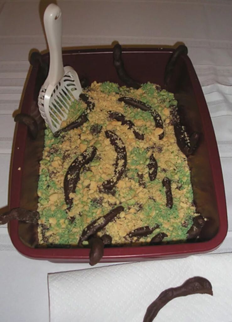 这是一块(盆)全素的蛋糕,加了巧克力做成了猫砂+翔的模样。不要说见到实物,估计隔着屏幕都已经感受到被猫翔支配的恐惧了。更不要说在这样的场景背后,很可能还有一只菊花里夹着半截残留翔,满屋乱跑乱蹭的主子殿下。