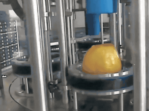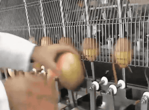 如何对付内核不前后左右对称的水果呢?以芒果为例,首先是人工给排排坐,送进去后上面下来一个管子压住小芒果,也是自适应表面开始自动削皮。