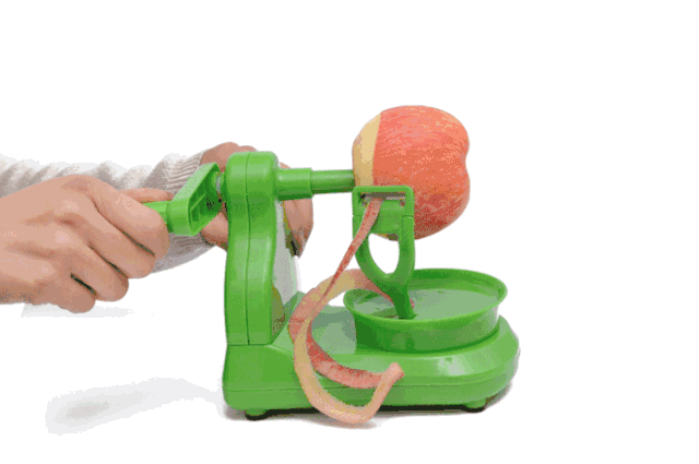 大家可能用过或见过懒人削皮机。只要把苹果插在支架的横针上固定好,转动杆子让刀片与苹果表面摩擦,就能轻轻松松让苹果皮自上而下地与果肉分离。