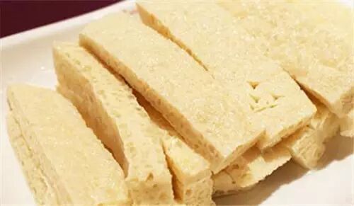 经常出现在火锅、麻辣烫和凉菜中的脆豆腐,其实并不是一种豆腐,而是用豆腐二次加工成的一种豆制品。把豆腐放在专用的工具中压榨出大多数水分,就成了薄片状的豆皮,也叫千张。把这种豆皮卷成卷儿,横切成圆片再下锅油炸,最后用碱水浸泡,就成了多孔的脆豆腐了。