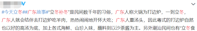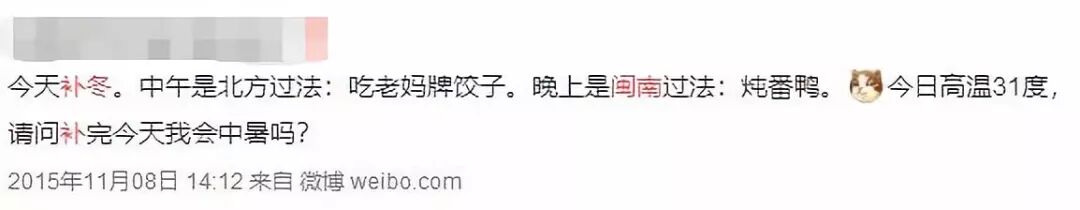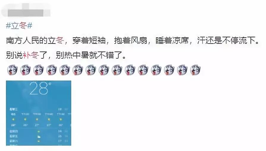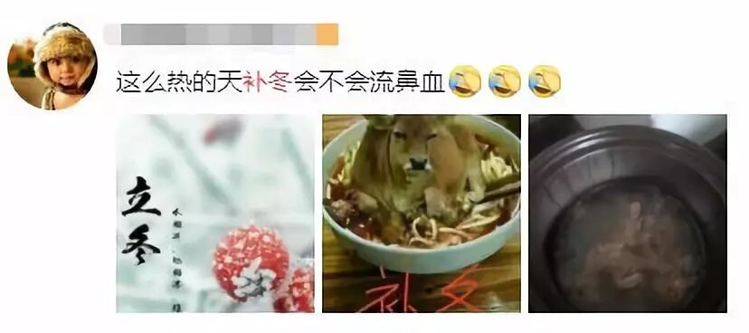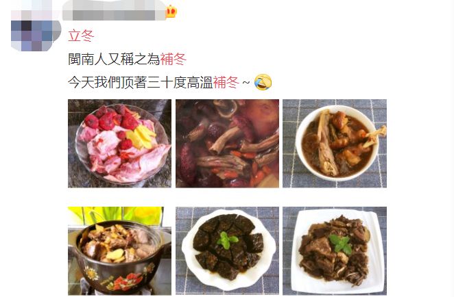 民间有立冬要补冬的习俗,北方吃饺子,南方吃鸡鸭鱼肉。30℃高温也阻止不了广东、福建地区的人民以补冬为借口一边大吃大喝,一边纠结:一桌的羊肉炉、四物汤、姜母鸭、麻油鸡、猪脚煲吃不完怎么办?这么热的天“补冬”会不会流鼻血、中暑……