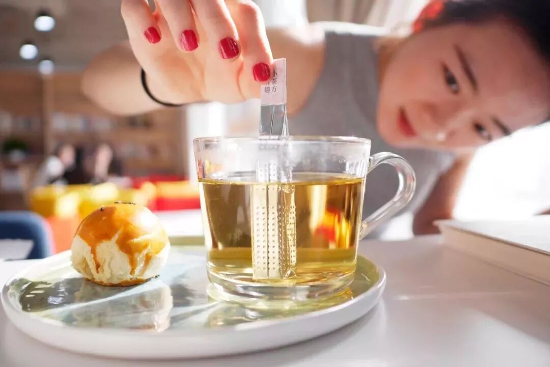 这得益于茶包的独特设计:四方形的包装,向内打孔。当横向放置的时候,水平面低于孔壁,不会轻易流出。免去了把袋泡茶拎出来无处安放的手忙脚乱,尽显优雅文艺。