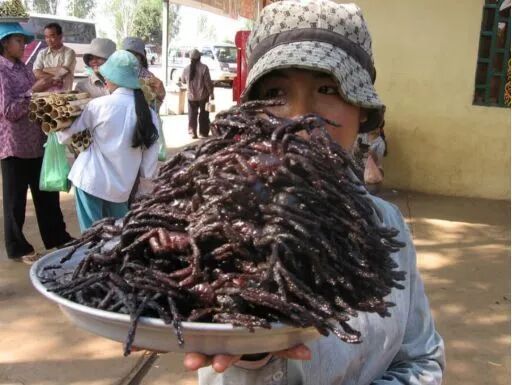 这样一大盘蜘蛛端上来,你说你吃不吃得消?然而和烤猪眼属于广西特色小吃一样,这种小吃也在柬埔寨一个名为Skuon的小镇里大受欢迎。蜘蛛先用味精,糖和盐腌一腌,然后用大蒜煎炸即可出锅。鸡肉味(并不),嘎嘣脆!