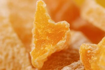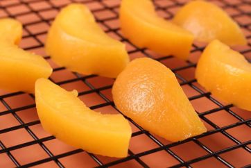 黄桃去皮后,手工切片,小火慢烘,将黄桃干的含水量控制在20%后,对黄桃干进行回软,再次进行慢烘,含水量只有控制得好,才能有恰到好处的外脆内软的口感。