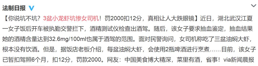 今天,“3盆小龙虾坑惨女司机”的新闻悄悄爬上了微博热搜。原来,一位女子滴酒未沾,却在饭后开车时被交警测出了酒驾,扣12分,扣驾照,还被罚款2000元。