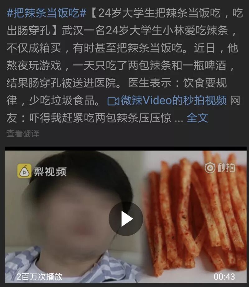 辣条是非常流行的小零食,江湖上关于它的传说也很多,甚至一度成为人们心目中奢侈的零食。但昨天一条200万次播放的视频新闻报道称,武汉一名24岁大学生爱吃辣条、把辣条当饭吃,结果导致肠穿孔送进医院。这让很多喜欢吃辣条的人们坐不住了:辣条真的会导致胃肠穿孔吗?还能放心吃辣条吗?