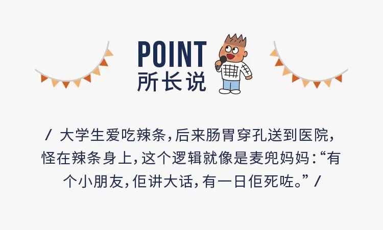 可见,导致胃肠溃疡、穿孔的因素有很多。而新闻中的大学生喜欢熬夜打游戏,而且基本都不正常就餐,每天就把几包辣条当饭吃,通过新闻我们可以看出,他进食不规律,的确会增加胃溃疡的风险。但是,如果把胃穿孔的原因完全归咎于辣条那就太片面了,毕竟导致胃溃疡的原因太多了。况且他这里最大的问题是饮食不规律,不按时吃三餐。