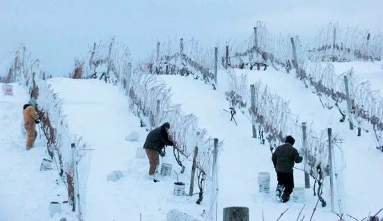 世界上能产冰酒的国家并不多,比较著名的有加拿大、德国、奥地利等。因为冰酒的酿造对当地的气候和地理条件都有要求,气温要在-8℃维持至少12个小时,而且要求是自然结冰的葡萄。而且冰葡萄的采摘和压榨也都要在室外低温环境下进行,通常采摘的温度是-10℃~-13℃,采摘时间是凌晨,真的是“粒粒皆辛苦”,心疼采摘工人一分钟。