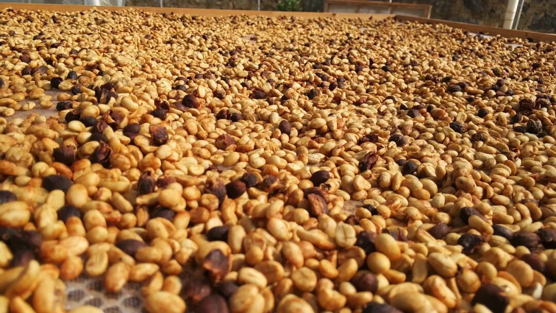 8bit咖啡云南的处理厂,正在晾晒中的蜜处理云南豆,豆子表面斑驳的痕迹就是去皮后带着果胶晾晒的结果。