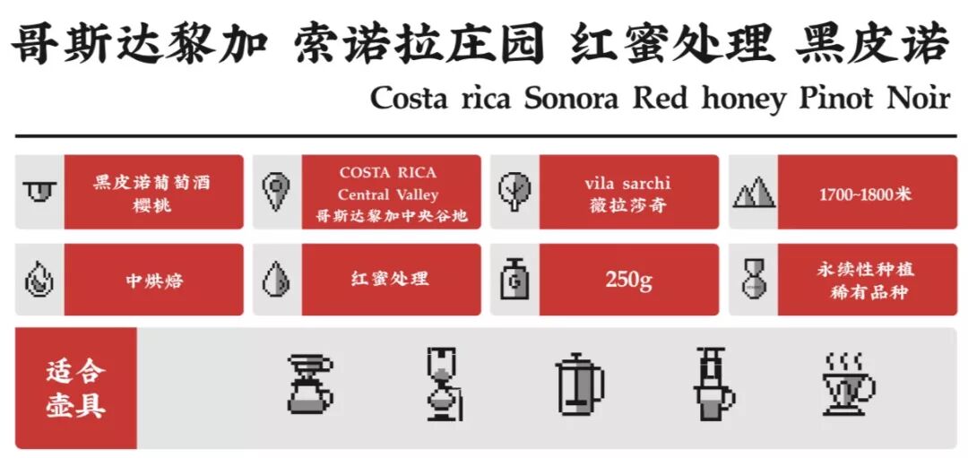 60年代最先在哥斯达黎加西部谷地发现的品种,是波旁的一支变种,在当地有神之礼物,神之咖啡豆之称。全球的品种都倾向于抗病与高产的新品种研究方向,这类原始突变种已经很少种植。万幸历史悠久的索诺拉庄园依然留存有这些古早品种。我们精心挑选了能表现出这个品种独特的优雅酸质和干净度的红蜜处理法,最终呈现出来风味更偏向带酒韵的回甘的“黑皮诺”。