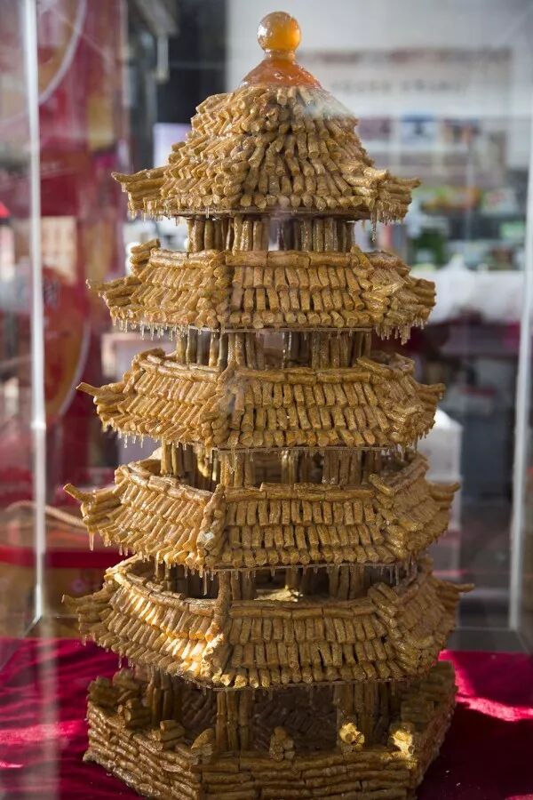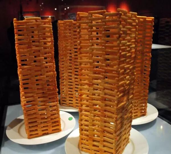 蜜供,从名字就可以看出来,这个吃食是以蜜糖为主,主要用途是为了做供品。传说明英宗在夺门之变后赏赐功臣,制蜜供赐予功臣。但一般认为蜜供是旗人传统的糕点,随满清入关带到北京的。《天咫偶闻》中记载:“蜜供,则专以祀神,以油面作荚,砌作浮图式,空中玲珑,高二三尺,五具为一堂,元日神前必用之。”这里写如何做蜜供,用了一个“砌”字,就说明了蜜供制作的工艺。