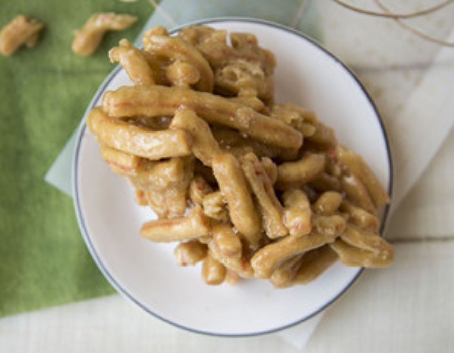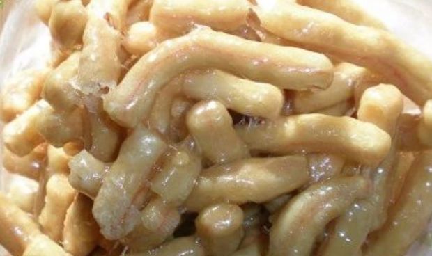 这蜜供主要配料是面粉、饴糖、蜂蜜、桂花和油,先用油、开水、小苏打和面,这种用开水和的面做熟以后发红,也叫烫面。将和好的面擀成薄皮,涂一层红色,叠成卷,再将卷的两个长边切掉,露出里面的红色,这样的蜜供条两边都会有一道红色的线,这也是蜜供条的特点。然后把蜜供条炸成焦黄,放凉后,再放入由糖、饴糖、蜂蜜和桂花兑好的糖汁里“过浆”,过浆的糖条锃光发亮,很是好看。