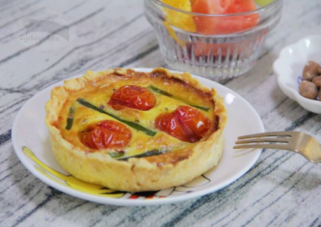 4、芦笋、小番茄马茹派皮内,倒入蛋液,入预热过的烤箱180度烤35分钟。