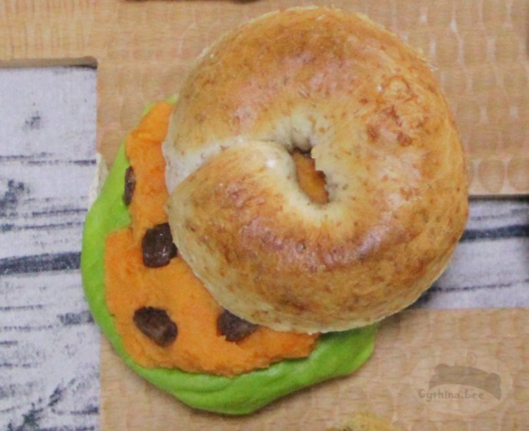 3、按贝果、生菜叶、南瓜果酱、酒渍葡萄干、贝果的顺序组装。
