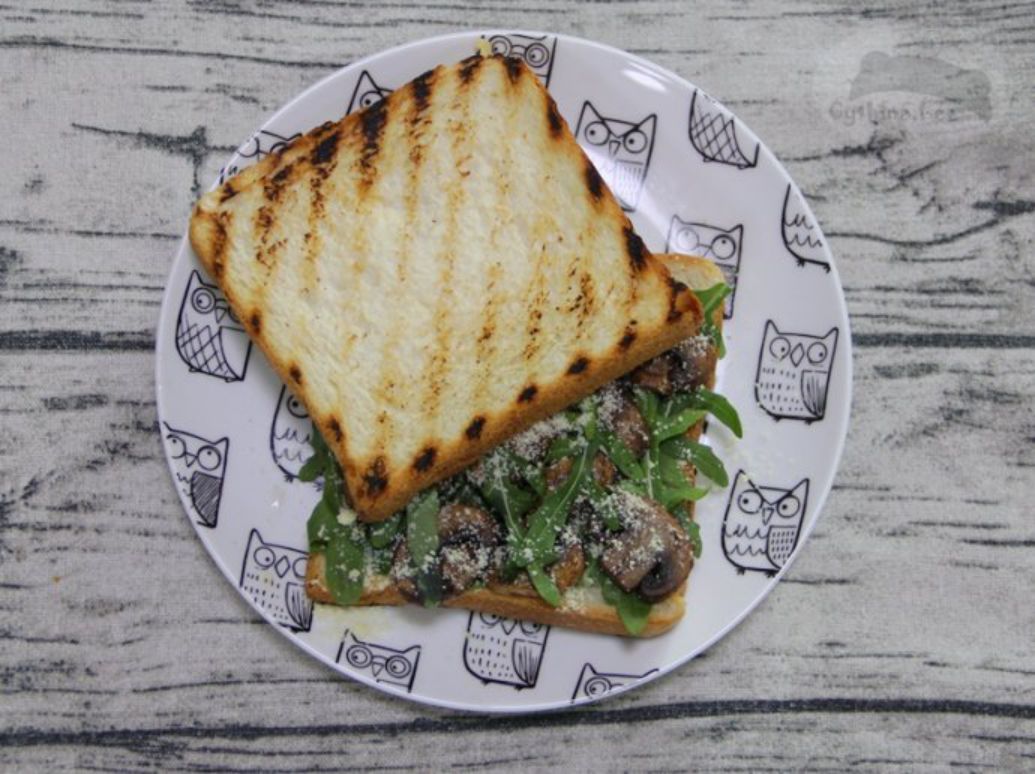 3、按吐司、芝麻菜、蘑菇片、芝麻菜、吐司的顺序组装三明治,喜欢的话,还可以撒一些芝士粉增加风味。