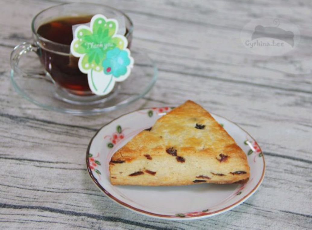 中筋面粉100g,泡打粉3g,淡奶油75ml,糖30g,盐少许,葡萄干一小把,朗姆酒适量。
