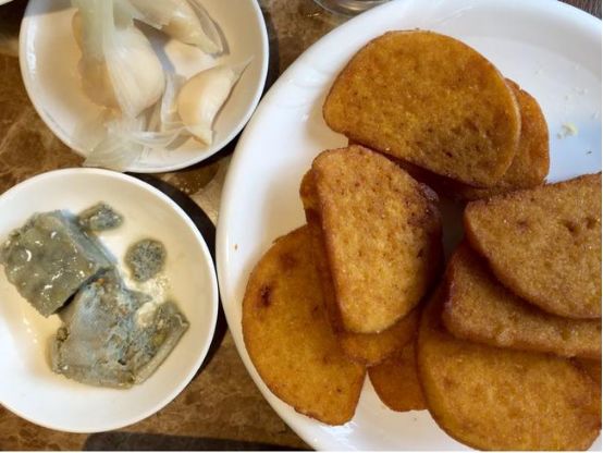 吃着吃着,一种似曾相识的感觉从舌头上涌现了出来——这不是炸窝头配臭豆腐么!刚炸好的窝头片还有点烫手,蒯一块儿臭豆腐抹在窝头片上。一口咬下去,满嘴嘎嘣脆的浓郁,好吃到忍不住举起双手放烟花。