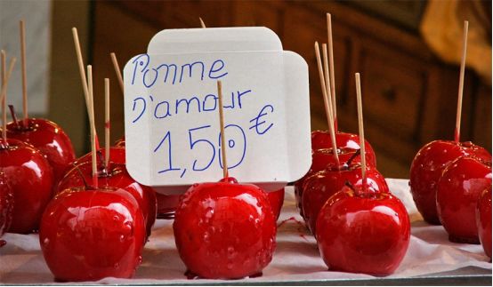 欧洲不少国家是有节日吃苹果糖(Candy apple)的习惯。例如英国焰火节,又称为福克斯之夜,每年11 月 5 日夜晚,英国人借以庆祝 1605 年炸毁议会大厦的阴谋失败,保留了吃苹果糖的传统。红红的苹果外面裹一层糖,一口啃下去甜滋滋的。在法国,这样的甜食当然要有个很甜的名字——爱情果(pommes d'amour)。