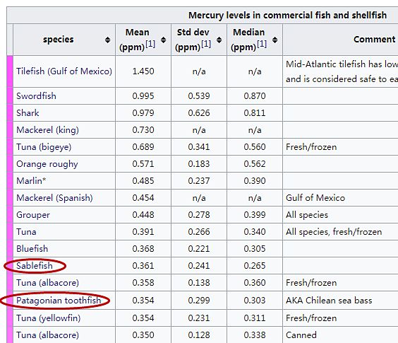 那么,银鳕鱼的甲基汞含量是怎样的呢?美食药监局FDA“商业鱼类和贝类甲基汞含量数据”(2012)给出了两种银鳕鱼的甲基汞含量情况为:裸盖鱼(Sablefish)甲基汞含量的平均值为0.36ppm、中值为0.26ppm;小鳞犬牙南极鱼(Patagonian toothfish)甲基汞含量的平均值为0.35ppm、中值为0.30ppm。(这里ppm等于mg/kg)