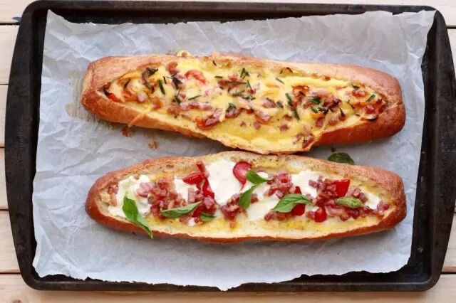 将鸡蛋牛奶混合物倒入两条长棍面包。一条上面放上培根,再放上炒好的甜椒和碎干酪。另一条长棍可以放上圣女果和碎奶酪,制作出不同的口味。