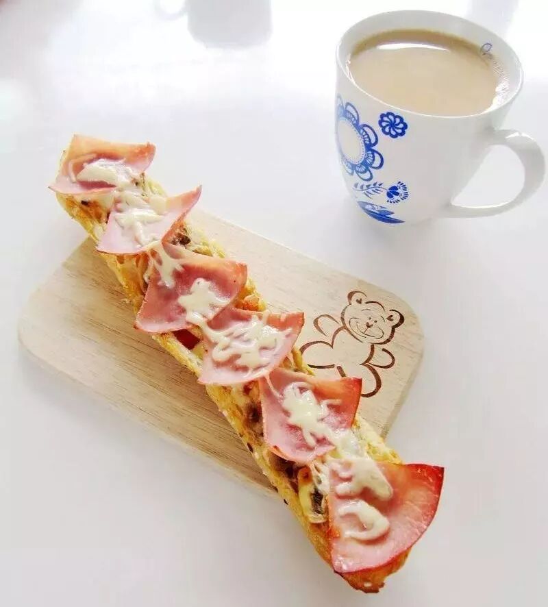 这个相当快手,法棍中间剖开加蘑菇,火腿片和奶酪烤一下就可以了,基本属于快手早餐,而且可以中间切断直接打包带走,节省时间。
