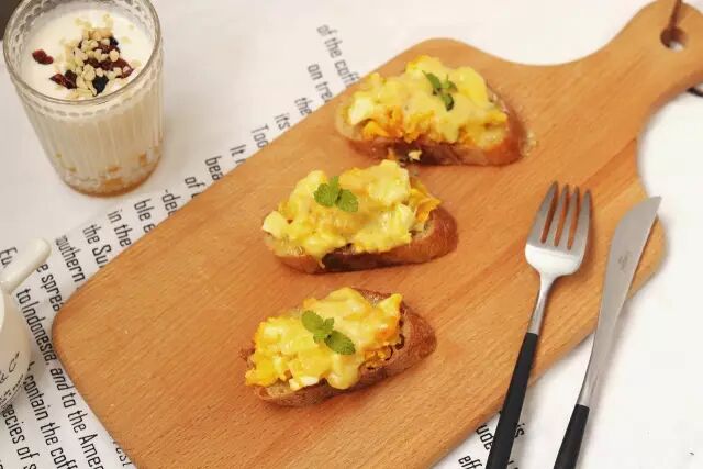 法棍切成小块,抹上南瓜鸡蛋泥,撒上少许黑胡椒。
