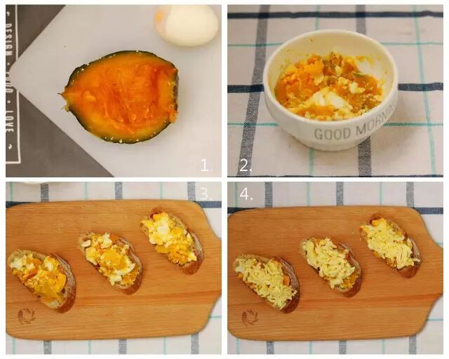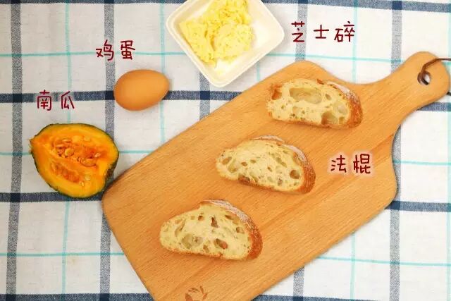 食材:1/4个南瓜、一个鸡蛋、一小段法棍、少许马苏里拉芝士、少许黑胡椒。