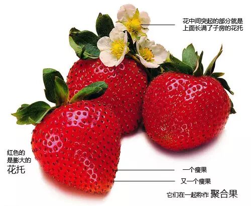 上文中的浆果通常被翻译为“莓”,但草莓并不是“莓”。草莓可食用的部分是膨大的花托,上面的每一粒“籽”是一枚雌蕊发育成的一个果实,这种果实本身果皮坚硬、不开裂,只含有一粒种子,植物学上叫做瘦果。类似的还有树莓、黑莓,它们也都不是莓——浆果。
