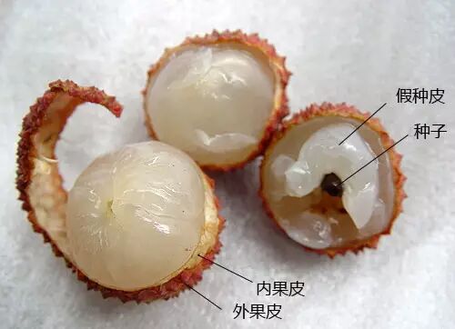 荔枝的所有果皮一起组成了被剥掉的外皮部分,透明美味的“果肉”,是由胚珠发育成的“假种皮”。跟它一样的还有龙眼,也就是桂圆。