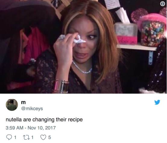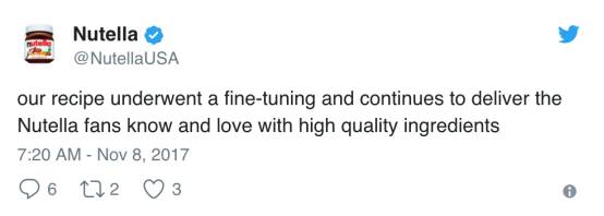 最开始,Nutella先是在自己的德国脸书页面宣布了这一令全世界粉丝心碎的消息,随后美国的官方推特也更新并确认了这一事实,声明中用到了“微调”(fine-tuning)一词,可能是为了尽可能平息粉丝的怒火吧……