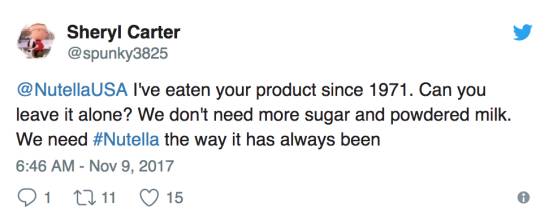劳资从1971年开始就吃你们的产品了!你们能不能就让它好好的?我们不需要更多的糖和脱脂奶粉!我们需要Nutella原来的样子!