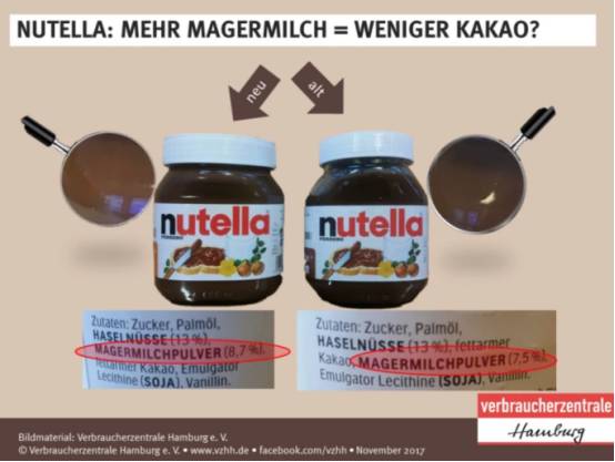 微调又是怎么个微调法呢?从图中我们不难发现,脱脂奶粉的含量从7.5%上升到了8.7%,同时含糖量也有所上升。放大镜中显示,新版Nutella的颜色变浅了一些,可能是因为可可的含量减少了。榛子巧克力酱已经够甜了,你还增加奶粉和糖的含量,重要原料似乎也减少了,是要闹哪样?