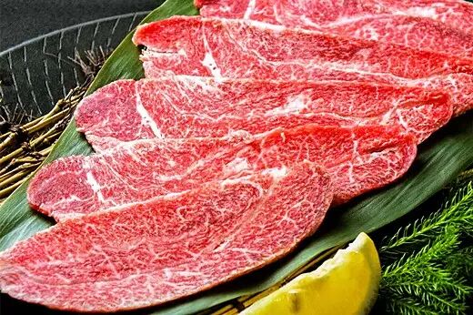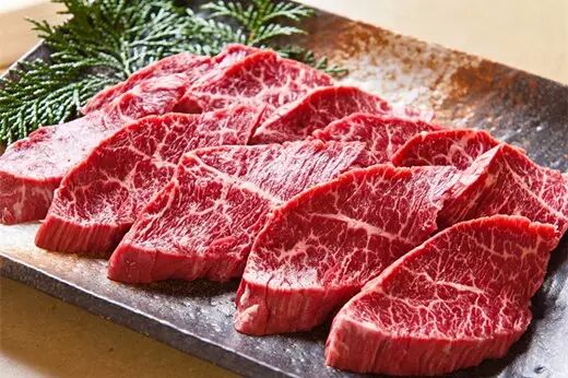 牛后腰部分的肉,肉质细腻,周围有一圈脂肪层,霜降程度非常明显,也是烧肉中的高级部位。
