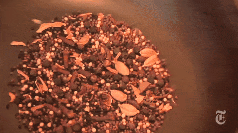 在使用之前,把要用到的坚果和干性调味料放在锅里用小火煎焙一下,会把它们的香味激发出来。使用煎焙过的调味料,会让你的厨艺轻松上升一个层级。一些湿性调味料同理,比如郫县豆瓣酱。之前我做鱼香肉丝总觉得味道不对,直到后来老师上课教的时候,说要先把豆瓣酱煎香。锅里放底油,把豆瓣酱倒入,煎炸到油的颜色红亮就行了。记住,煎焙调料,一定要用小火,煎出香味就行,千万控制火候,不要糊掉。