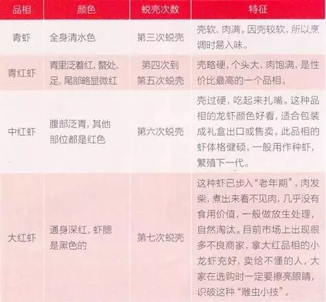 小龙虾的生长伴随着蜕壳,每蜕壳一次便长大一些,一生共会蜕壳11-12次。在销售期内会蜕壳七次,大致可以分为4或5个阶段,每个阶段的品质都不一样。其中以青壳、青红壳上佳,大红、黑壳最次。