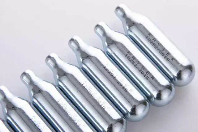 工业用或医用笑气是装在钢瓶中的,而咖啡店、蛋糕店里用的笑气则装在微型钢瓶里。它长得像一枚光溜溜的子弹,大约6厘米长,里面有8克左右的压缩笑气。